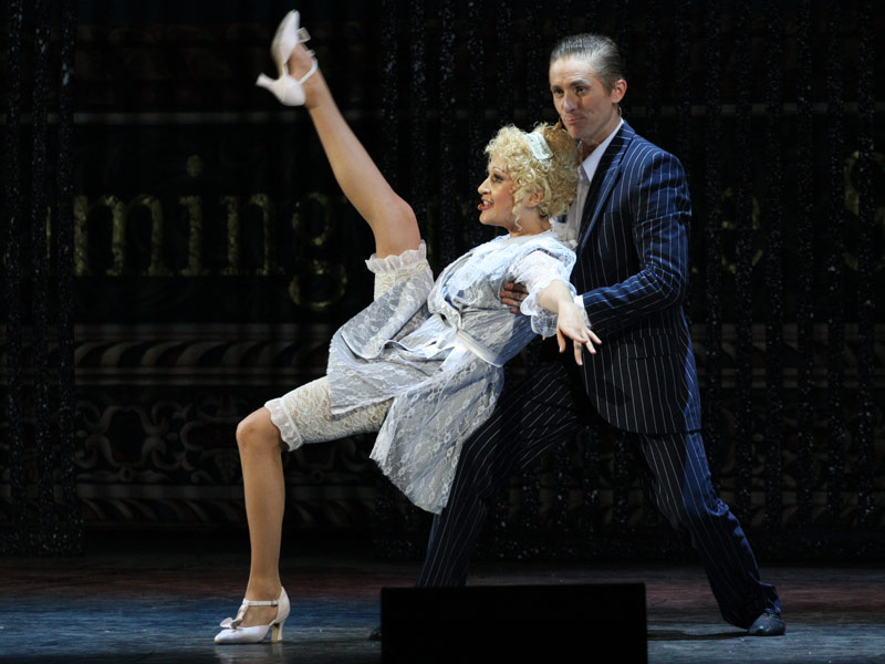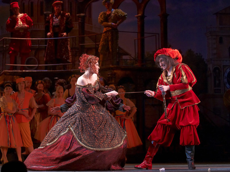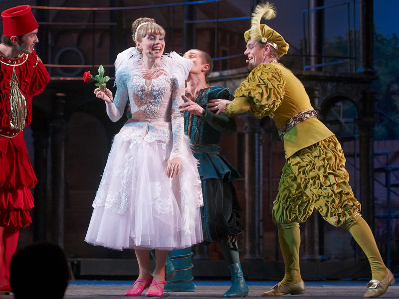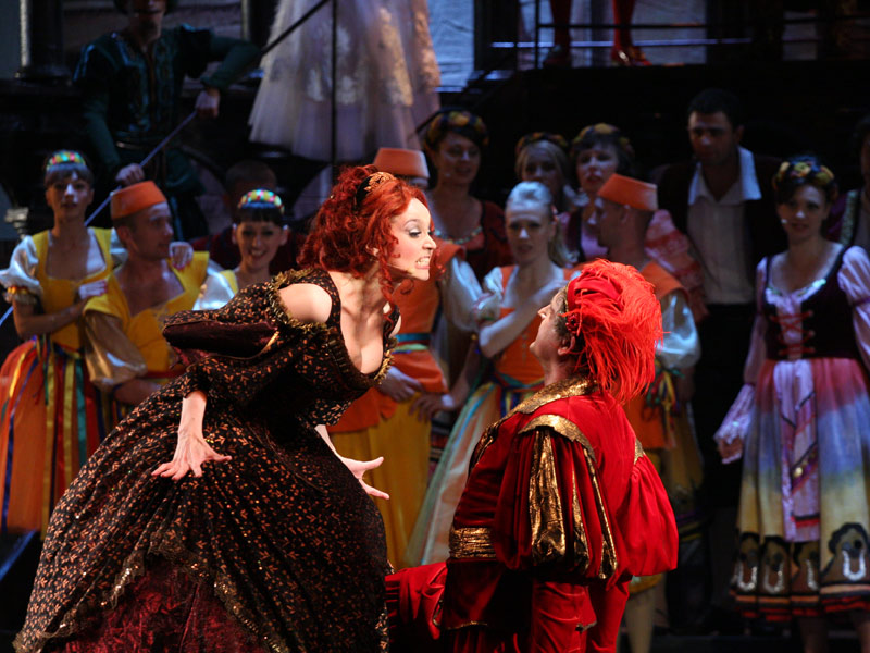 «Kiss me, Kate!» is one of the most well-known musical of American composer Cole Porter who is the author of numerous works for theatre and cinema. It is the only one work of master in which he addresses to William Shakespeares comedy "The Taming of the Shrew". Opening night of musical took place in New-York on 30th of December 1948. Performance is structured as a play within a play. Actors play on the stage famous Shakespeares comedy performing parts of main characters - Katharine and Petruchio. And a lot of situations which are mentioned in plot of the play are projected on their own characters and today private life in surprising and witty way. This peculiarity gives particular charm to every situation that happens both on stage and in life. Music by Cole Porter is so tuneful and it is easy to remember, few melodies of this performance already became classic, in this music lyricism is combined with humor. The performance is recommended for viewers aged 12 and above